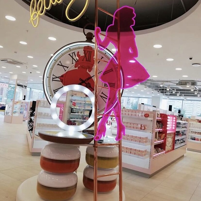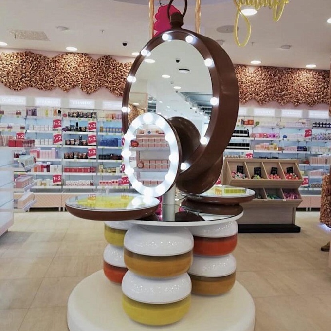 - Привлекательный дизайн. Форма, отсылающая к миру косметики, гармонично вписывается в интерьер магазина и усиливает бренд.