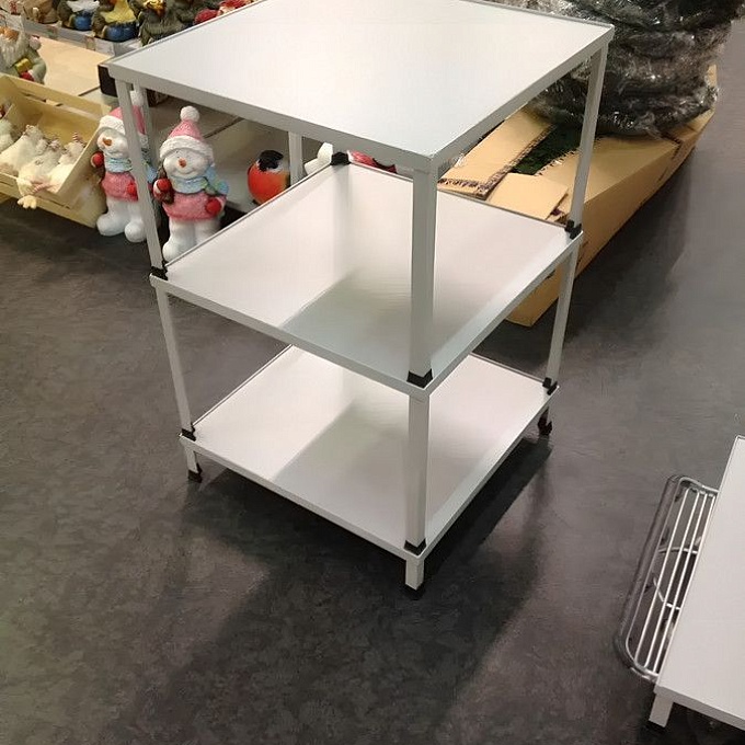 - Устойчивость и удобство. Прочный каркас гарантирует стабильность конструкции, а отсутствие задних поверхностей и фасадов облегчает выкладку и обслуживание.