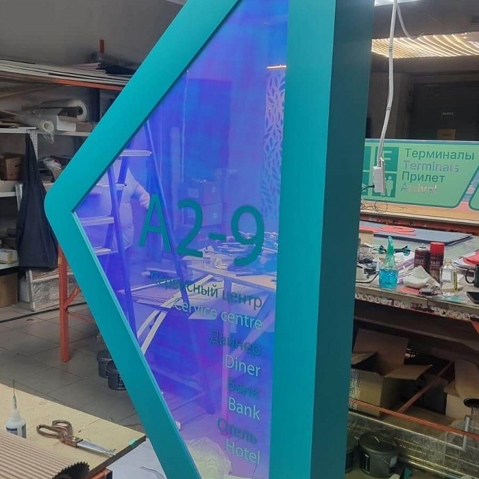 Компания «Авторгрупп» разработала и изготовила световой навигационный пилон с оригинальным дизайном и переливающейся LED-подсветкой. Указатель предназначен для ориентации посетителей в общественном пространстве — отелей, аэропортов, торговых и сервисных центров.